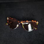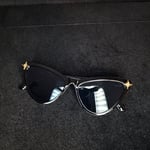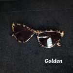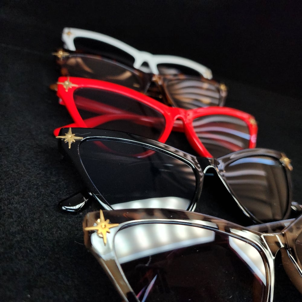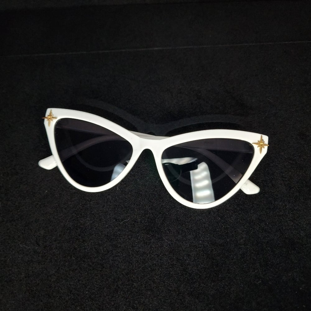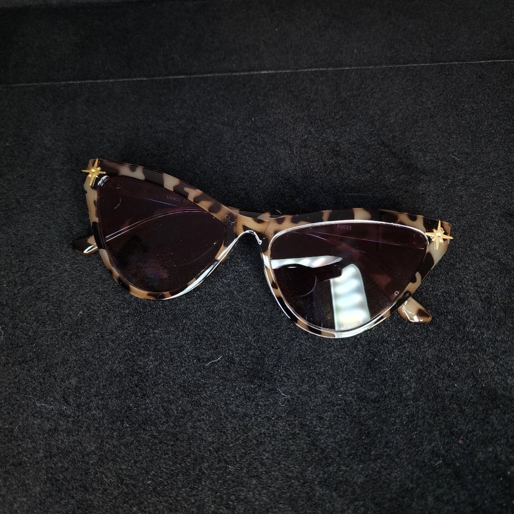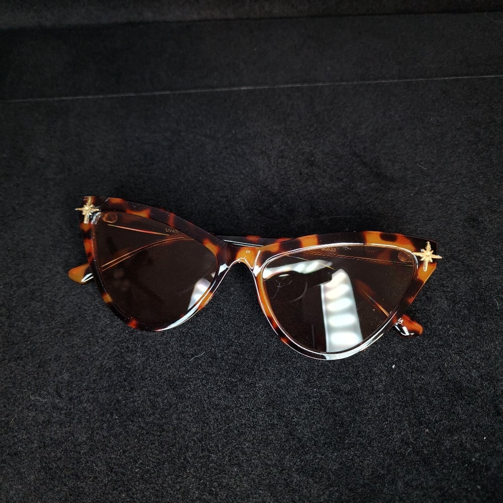 Retro style cat eye sunnys. Keep the sun out of your eyes and walk like a diva in these beautiful golden Starburst adorned on each corner.