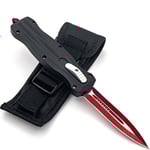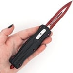 The Splash Zone Automatic OTF Knife is an out the front knife with a contoured aluminum handle and red stainless-steel blade. The switch to deploy the blade is in the center of the handle as opposed to the side. This means that it is easier to deploy the blade with one hand. The blade itself is a deep crimson shot through with tens of curves creating a lattice of texture along the blade face. There is a fuller in the center of the blade with hole cutouts to reduce weight and provide balance. The smaller details are always the showstoppers, aren’t they? Not only is the blade on this beauty a deep red in contrast to the matte black handle, the screws themselves that are in the handle are red as well. This tiny detail enhances the design and elevates it to something truly breathtaking. Careful though, the first three rows are the splash zone. Overall Length: 9 Inches, Blade Length: 3.75 Inches