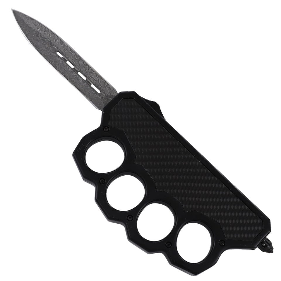 The Sinners Inc. Damascus Steel OTF Trench Style Knife is a perfect blend of tactical functionality and striking design. This dual-action automatic knife features a damascus steel spear point blade, created from 1095 and 15N20 steel layers, offering superior cutting ability and a stunning wave pattern.